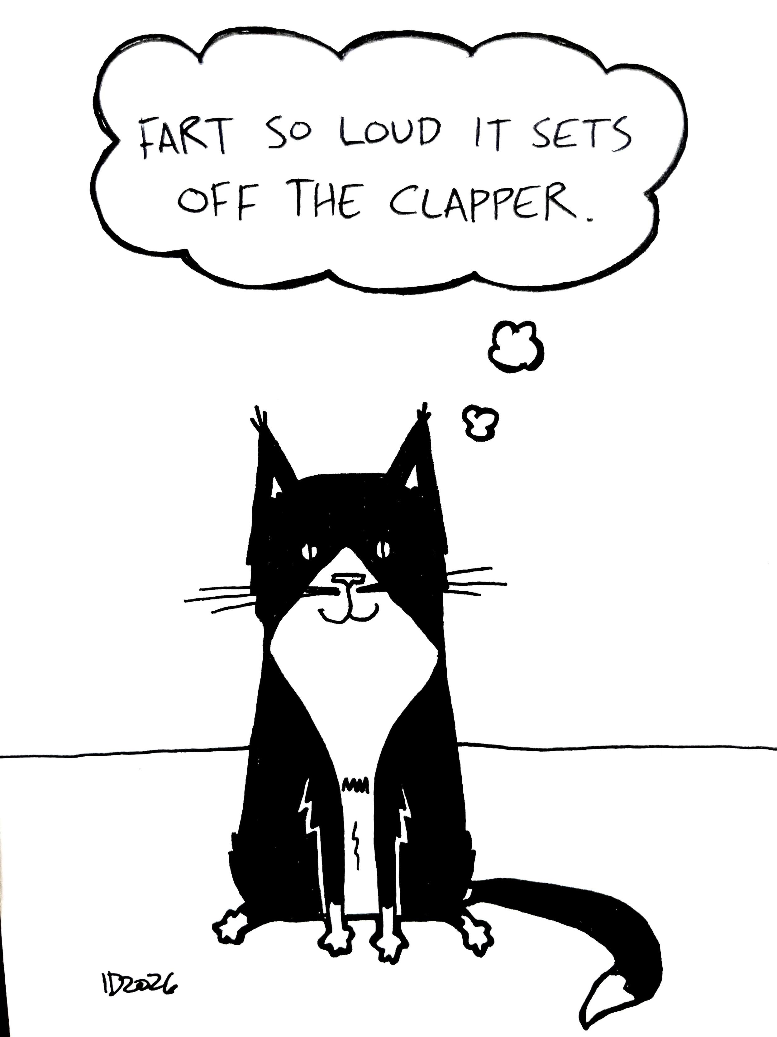 a tuxedo cat sits and thinks "fart so loud it sets off the clapper."