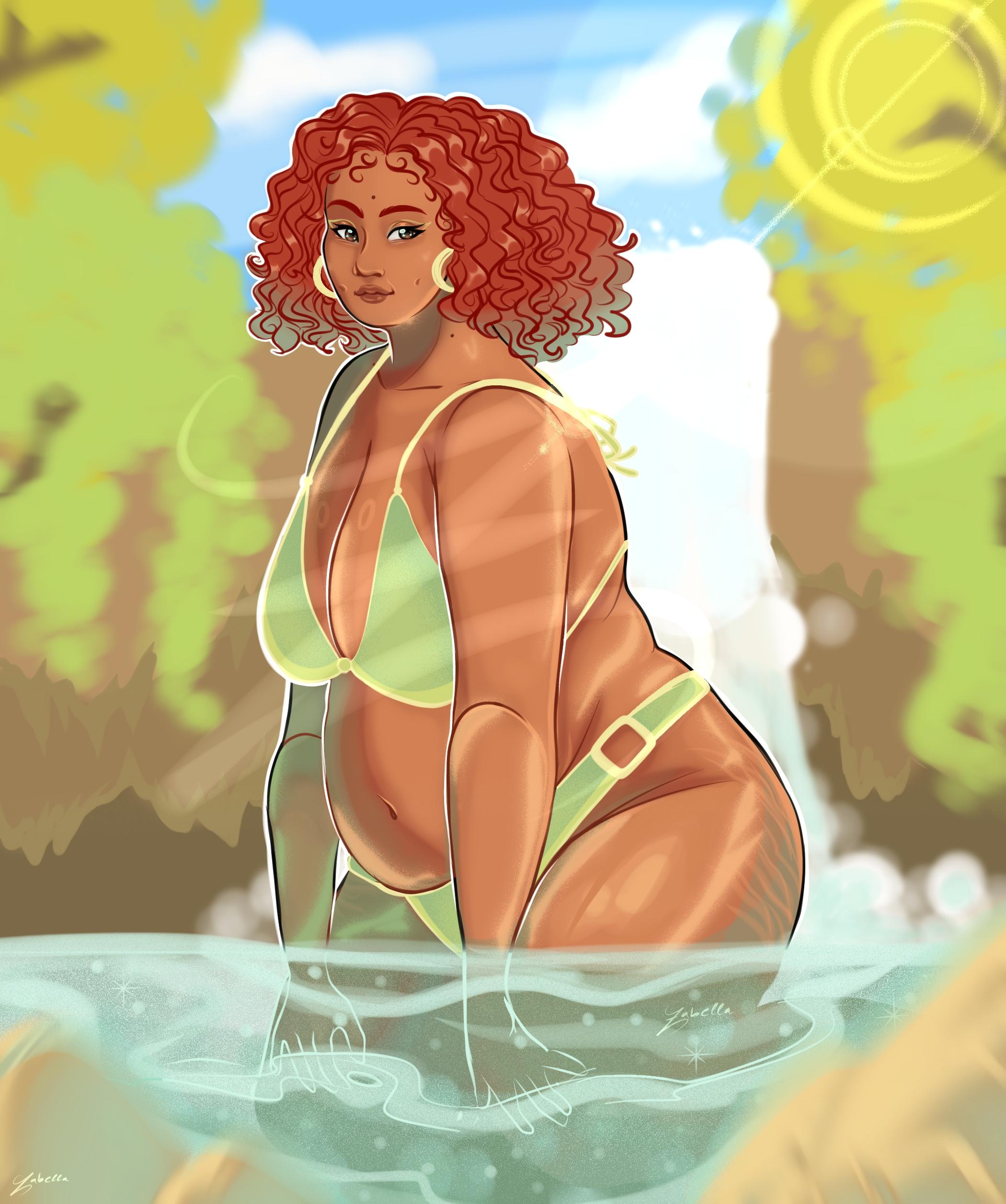Ilustração de uma mulher de pele brimzeada, cabelos curtos e cacheados pintados na cor ruivo acobreado, usando um biquíni verde limão e agachada em um lago, ao fundo uma foto de referência de uma cachoeira para o cenário.