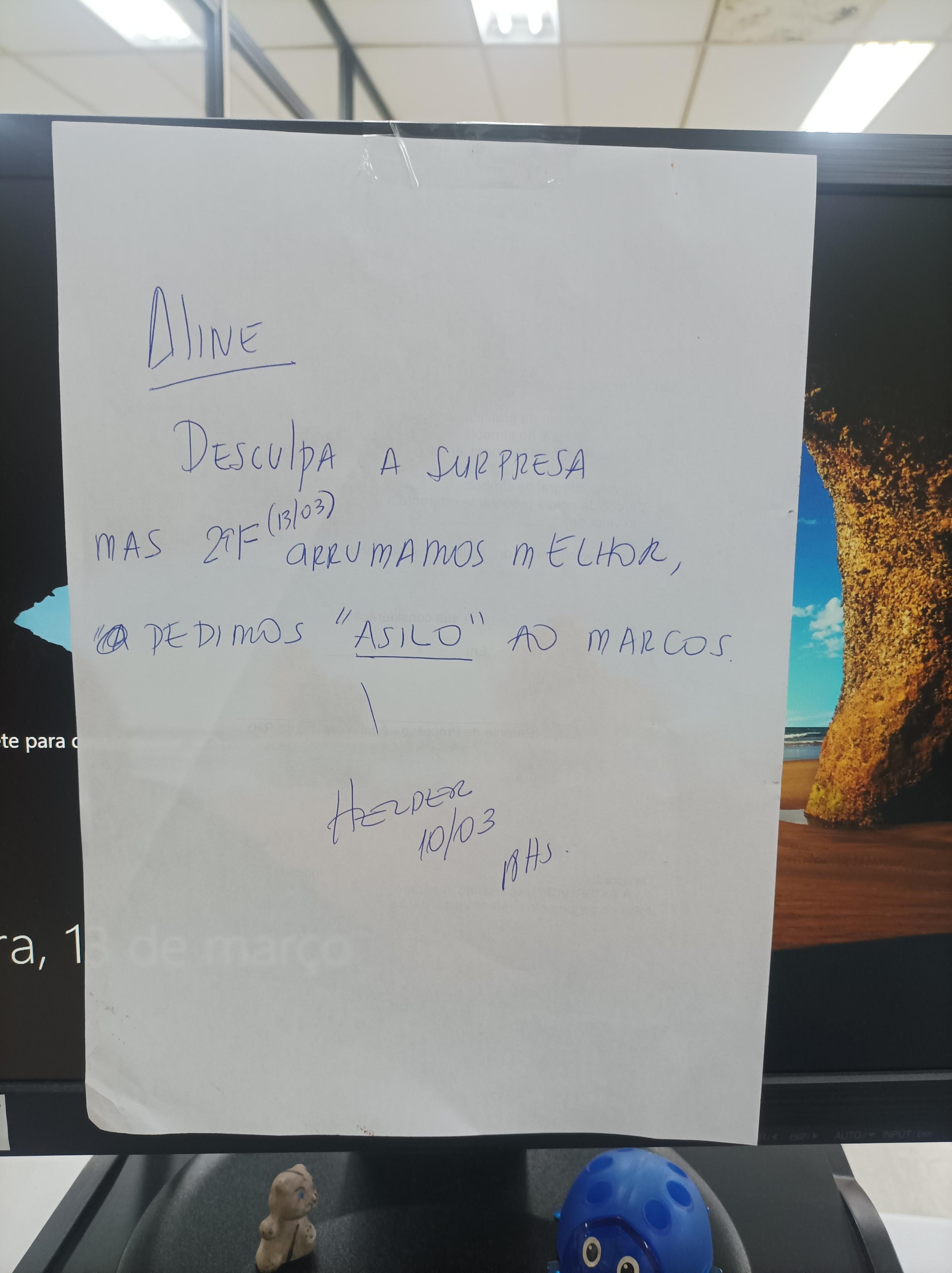nao da pra ver na foto, mas um amigo colou acima d oquadro ao fundo em letras 156 de alguma fonte que precisou imprimir em 2 A4 a frase "Nada é Simples" para as pessoas que chegavam com coisas simples pra gente resolver e a gente só apontava.